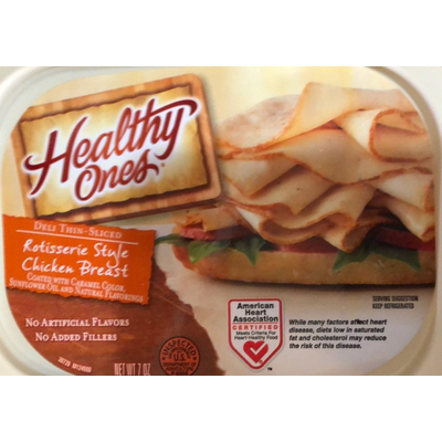 Healthy Ones Chicken Breast, Rotisserie Style Deli Thin-Sliced (6 slices) contains 2g total carbs, 2g net carbs, 1g fat, 10g protein, and 60 calories.