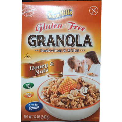 Sam Mills Granola, Buckwheat & Millet, Honey & Nuts, Gluten Free (0.5 cup) contains 33g total carbs, 30g net carbs, 10g fat, 5g protein, and 240 calories.