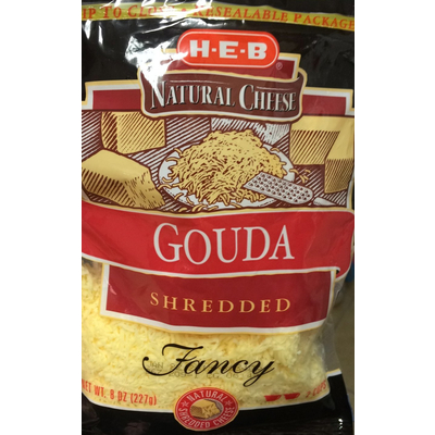 H.E.B. Natural Cheese Shredded Gouda (0.25 cup) contains 0.5g total carbs, 0.5g net carbs, 8g fat, 7g protein, and 100 calories.