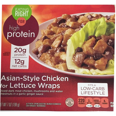 Eating Right Asian-Style Chicken for Lettuce Wraps (1 bowl) contains 12g total carbs, 12g net carbs, 11g fat, 20g protein, and 220 calories.