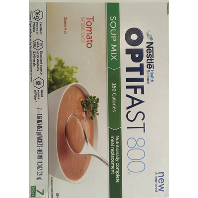 Optifast 800 Soup Mix, Garden Tomato (1 packet) contains 19g total carbs, 19g net carbs, 3.5g fat, 14g protein, and 160 calories.