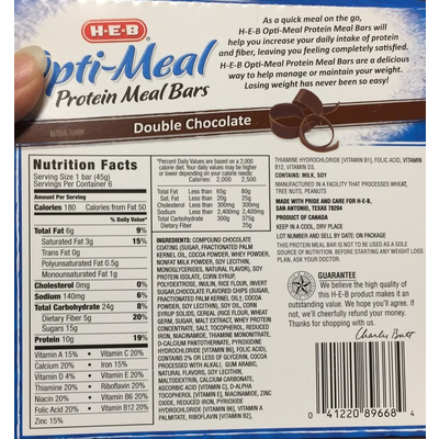 Carbs in H-E-B Opti-Meal Protein Meal Bars, Double Chocolate
