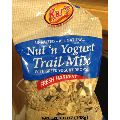 Kar's Nut 'n Yogurt Trail Mix with Greek Yogurt Drops! (0.25 cup) contains 12g total carbs, 10g net carbs, 10g fat, 4g protein, and 140 calories.