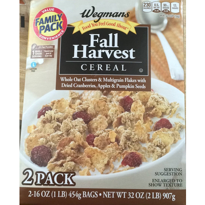 Wegmans Fall Harvest Cereal (0.75 cup) contains 43g total carbs, 40g net carbs, 5g fat, 5g protein, and 230 calories.