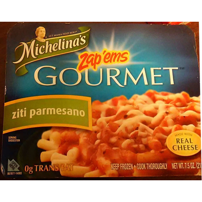 Michelina's Zap'ems Gourmet, Ziti Parmesano (1 package) contains 38g total carbs, 35g net carbs, 6g fat, 9g protein, and 240 calories.
