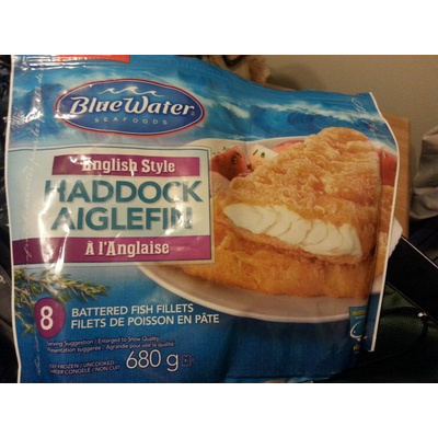 Carbs in Blue Water Seafoods Fish, English Style Haddock Aiglefin Battered Fillets