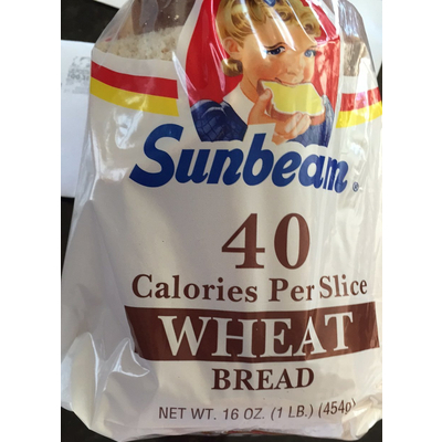 Sunbeam 40 Calories Per Slice Wheat Bread (2 slices) contains 20g total carbs, 14g net carbs, 0.5g fat, 5g protein, and 80 calories.