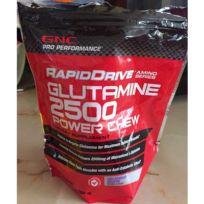 GNC Pro Performace Rapid Drive Glutamine 2500 Power Chew, Delicious Grape (1 soft chew) contains 1g total carbs, 1g net carbs, 0g fat, 0g protein, and 10 calories.