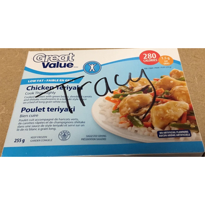 Great Value Chicken Teriyaki, Low Fat (1 tray) contains 51g total carbs, 50g net carbs, 1.5g fat, 16g protein, and 280 calories.