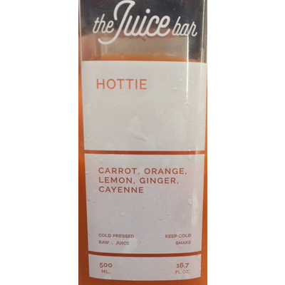 The Juice Bar Hottie Shake, Carrot Orange Lemon Ginger Cayenne (16.7 fl oz) contains 42g total carbs, 42g net carbs, 0g fat, 4g protein, and 190 calories.