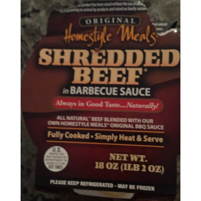 Homestyle Meals Shredded Beef in Barbecue Sauce (0.25 cup) contains 8g total carbs, 7g net carbs, 2.5g fat, 8g protein, and 90 calories.