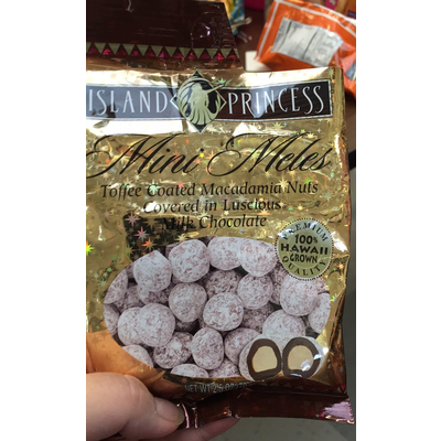 Island Princess Mini Meles, Toffee Coated Macadamia Nuts Covered in Luscious Milk Chocolate (1 oz) contains 12.5g total carbs, 10.5g net carbs, 13g fat, 2g protein, and 175 calories.