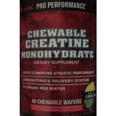 GNC Pro Performance AMP Chewable Creatine Monohydrate. Lemon-Lime (1 wafer) contains 2g total carbs, 2g net carbs, 0g fat, 0g protein, and 10 calories.