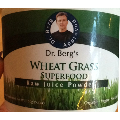 Dr. Berg's Wheat Grass Raw Juice Powder (1 scoop) contains 1g total carbs, 1g net carbs, 0g fat, 1g protein, and 8 calories.