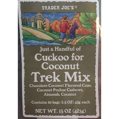 Trader Joe's Trek Mix, Cuckoo for Coconut (1 package) contains 19g total carbs, 17g net carbs, 17g fat, 4g protein, and 240 calories.
