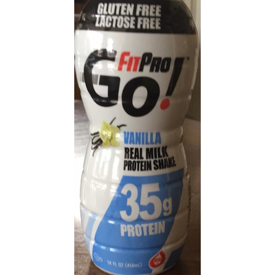 Fit Pro Go Real Milk Protein Shake, Vanilla (1 bottle) contains 10g total carbs, 8g net carbs, 2.5g fat, 35g protein, and 200 calories.