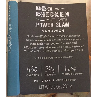Starbucks Grocery BBQ Chicken with Power Slaw Sandwich (1 package) contains 52g total carbs, 47g net carbs, 16g fat, 24g protein, and 430 calories.