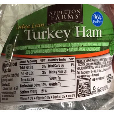 Appleton Farms Turkey Ham, Extra Lean (2 oz) contains 3g total carbs, 3g net carbs, 2g fat, 7g protein, and 60 calories.