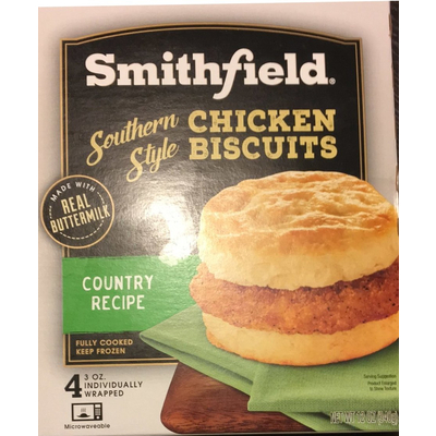 Smithfield Chicken Biscuits, Southern Style, Country Recipe (1 piece) contains 23g total carbs, 22g net carbs, 11g fat, 10g protein, and 230 calories.