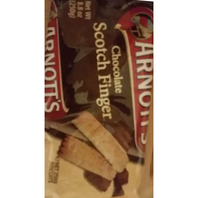 Arnott's Chocolate Scotch Finger (1 piece) contains 15g total carbs, 14.5g net carbs, 6g fat, 2g protein, and 110 calories.