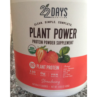 22 Days Nutrition Plant Power Protein Powder, Strawberry (1 scoop) contains 2g total carbs, 1g net carbs, 3g fat, 20g protein, and 110 calories.