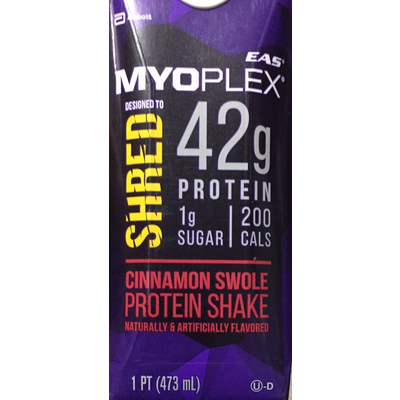 Abbott EAS, Myoplex, Protein Shake, Cinnamon Swole (16 fl oz) contains 7g total carbs, 5g net carbs, 1.5g fat, 42g protein, and 200 calories.