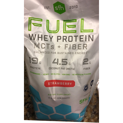 SFH Fuel Whey Protein, Strawberry (1 heaping scoop) contains 6g total carbs, 4g net carbs, 4.5g fat, 19g protein, and 140 calories.