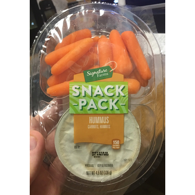 Signature Farms Hummus, Carrots (1 tray) contains 14g total carbs, 10g net carbs, 9g fat, 4g protein, and 150 calories.