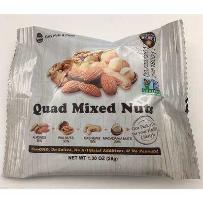 Daily Nuts & Fruits Quad Mixed Nuts, Almonds, Walnuts, Cashews, Macadamia Nuts (1 package) contains 5g total carbs, 3g net carbs, 16g fat, 4g protein, and 175 calories.