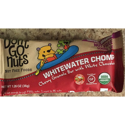 Don't Go Nuts Chewy Granola Bar with White Chocolate, Whitewater Chomp (1 bar) contains 27g total carbs, 26g net carbs, 2.5g fat, 2g protein, and 140 calories.