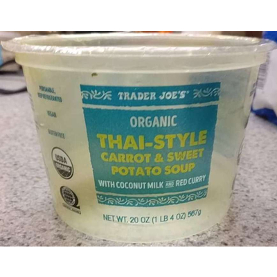 Trader Joe's Thai-Style Carrot & Sweet Potato Soup, with Coconut Milk and Red Curry (1 cup) contains 24g total carbs, 21g net carbs, 7g fat, 2g protein, and 160 calories.