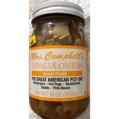 Mrs. Campbell's Vidalia Onion, Sweet Relish (1 tbsp) contains 6g total carbs, 6g net carbs, 0g fat, 0g protein, and 25 calories.
