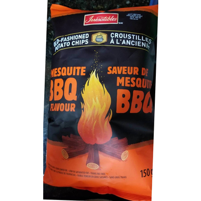 Irresistibles Mesquite BBQ Flavour Potato Chips (24 chips) contains 29g total carbs, 27g net carbs, 16g fat, 4g protein, and 260 calories.