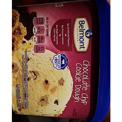 Belmont Ice Cream Creamy Vanilla Ice Cream, Chocolate Chip Cookie Dough (0.67 cup) contains 29g total carbs, 29g net carbs, 11g fat, 3g protein, and 220 calories.