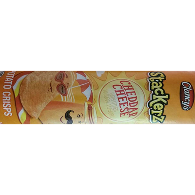 Clancy's Stackerz Cheddar Cheese (11 crisps) contains 15g total carbs, 14g net carbs, 9g fat, 1g protein, and 150 calories.