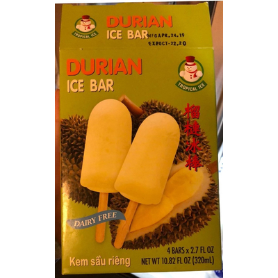 Tropical Ice Durian Ice Bar (1 bar) contains 16g total carbs, 14g net carbs, 7g fat, 0.5g protein, and 130 calories.