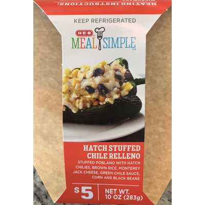 H-E-B Meal Simple Hatch Stuffed Chile Relleno (1 container) contains 29g total carbs, 25g net carbs, 12g fat, 12g protein, and 260 calories.