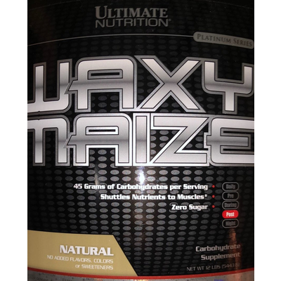 Ultimate Nutrition Carbohydrate Supplement, Waxy Maize, Natural (2 scoops) contains 45g total carbs, 45g net carbs, 0g fat, 0g protein, and 180 calories.