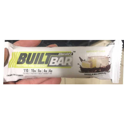 Built Bar Protein and Energy Bar, Birthday Cake covered in Milk Chocolate (1 bar) contains 13g total carbs, 7g net carbs, 4g fat, 15g protein, and 110 calories.