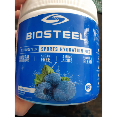 Biosteel Blue Raspberry Sports Hydration Mix Powder (1 scoop) contains 1g total carbs, 1g net carbs, 0g fat, 0g protein, and 5 calories.
