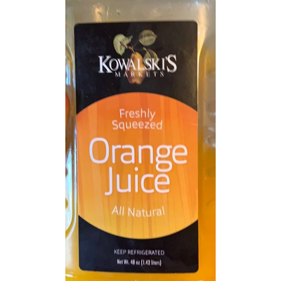 Kowalski's Markets Freshly Squeezed Orange Juice (4 fl oz) contains 12g total carbs, 12g net carbs, 0g fat, 0.5g protein, and 50 calories.