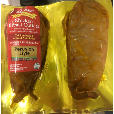 Wegmans Boneless Skinless Peruvian Style Chicken Breast Cutlets (4 oz raw) contains 2g total carbs, 2g net carbs, 5g fat, 23g protein, and 120 calories.