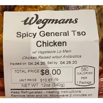 Wegmans Spicy General Tso Chicken (1 package) contains 62g total carbs, 60.5g net carbs, 25g fat, 25g protein, and 580 calories.