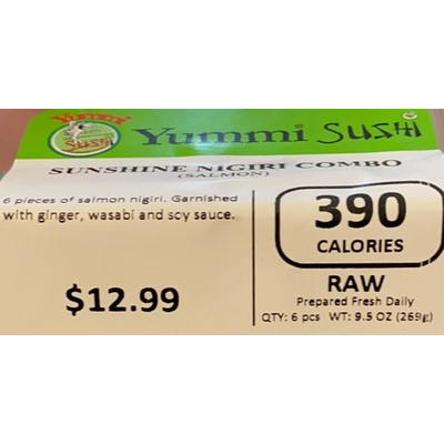 Yummi Sushi Sunshine Nigiri Combo Salmon (1 package) contains 60g total carbs, 60g net carbs, 6g fat, 22g protein, and 390 calories.