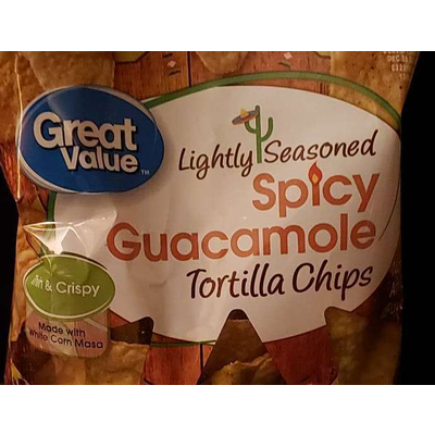 Great Value Lightly Seasoned Spicy Guacamole Tortilla Chips (8 chips) contains 18g total carbs, 17g net carbs, 8g fat, 2g protein, and 150 calories.