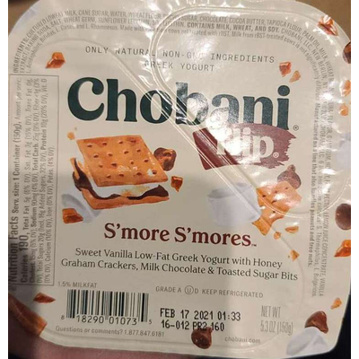Chobani Flip S'more S'mores Sweet Vanilla Low-Fat Greek Yogurt with Honey (1 container) contains 25g total carbs, 24.5g net carbs, 5g fat, 10g protein, and 190 calories.