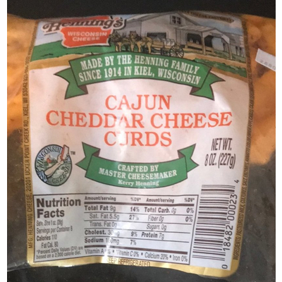 Henning's Wisconsin Cheese Cajun Cheddar Cheese Curds (1 oz.) contains 0g total carbs, 0g net carbs, 9g fat, 7g protein, and 110 calories.