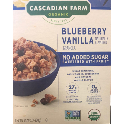 Cascadian Farm Organic Granola, Blueberry Vanilla (0.5 cup) contains 33g total carbs, 29g net carbs, 11g fat, 5g protein, and 250 calories.