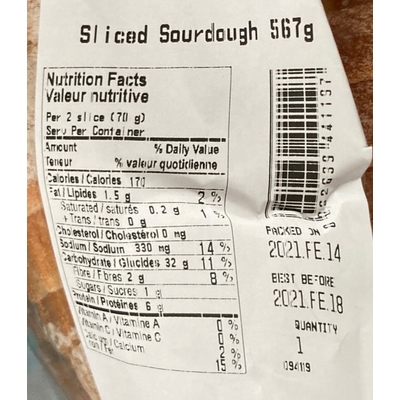 Save on Foods Sliced Sourdough (2 slices) contains 22g total carbs, 21g net carbs, 0.5g fat, 4g protein, and 110 calories.