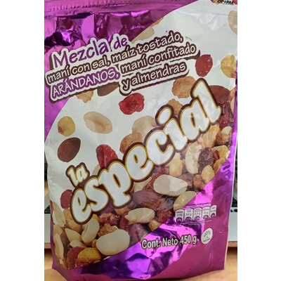 Carbs in La Especial Mezcla de Mani con Sal, Maiz Tostado, Arandanos, Mani Confitado y Almendras